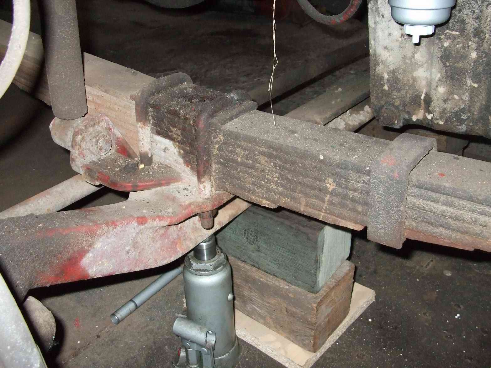 Bin gerade dabei, das Ausbauen der Blattfedern vorzubereiten. Das Auto ist arbeitsgerecht unter dem Rahmen aufgebockt, die Blattfedern sind vollkommen entlastet, die Augenbolzen sind schon lose. Die Federbriden habe ich schon vorher mal der Reihe nach vorgelöst und wieder angezogen, damit sie im aufgebockten Zustand leichter abzubauen sind.