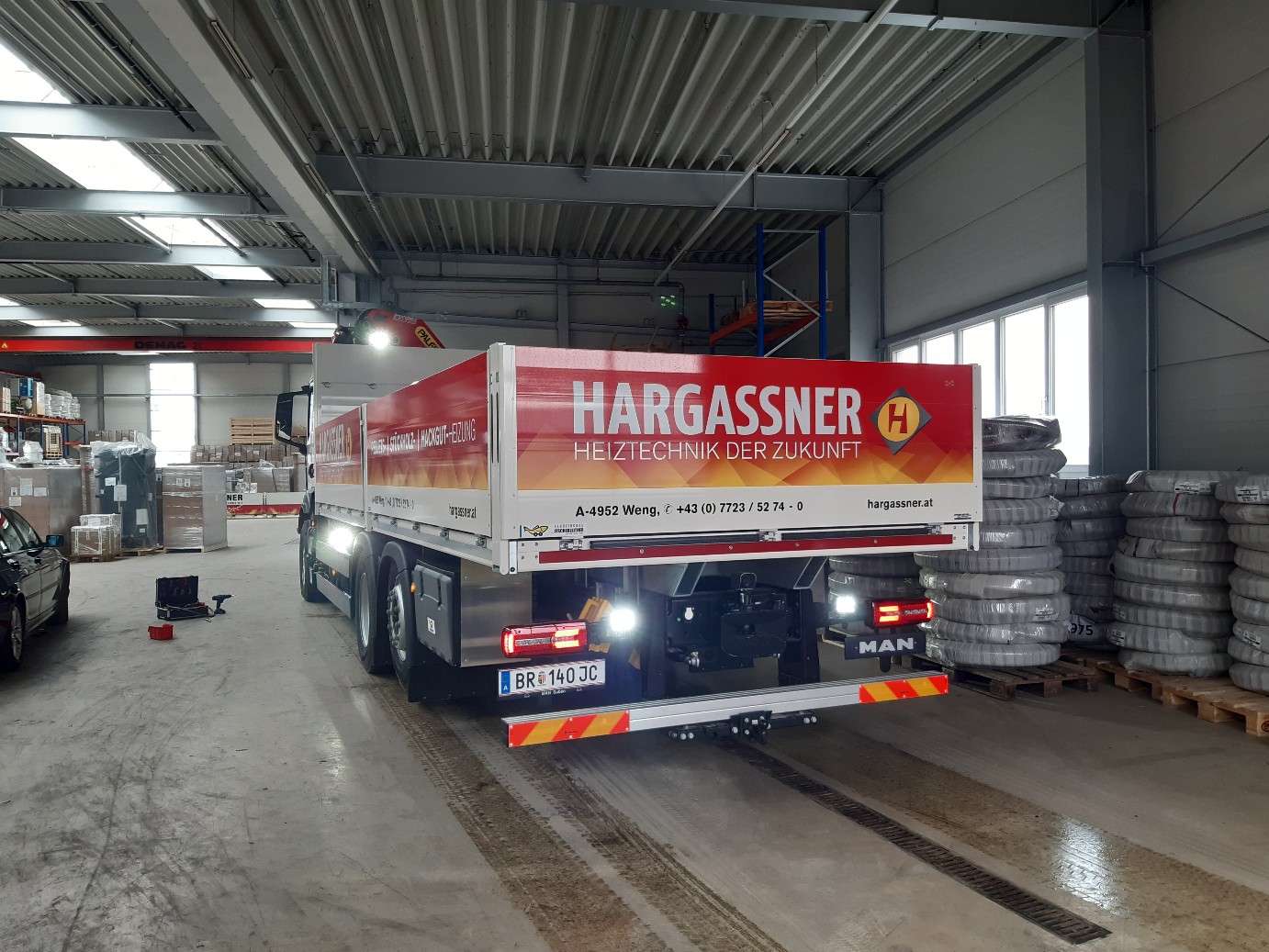 Momentan geschieht das noch mit einem auf der Pritsche montiertem "Mini-Kran". Bordwand auf, eine Stütze runter, die paar Paletten runterheben, mit dem Hubwagen in die Garage stellen, nach 10 Minuten gehts weiter.