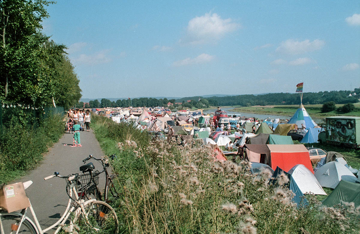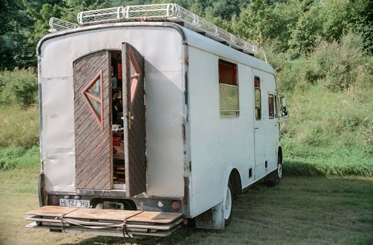 Aus dem Zelt der Blues Cooperative Berlin heraus auch ein Foto vom Bus der Sannyasin-Sekte.