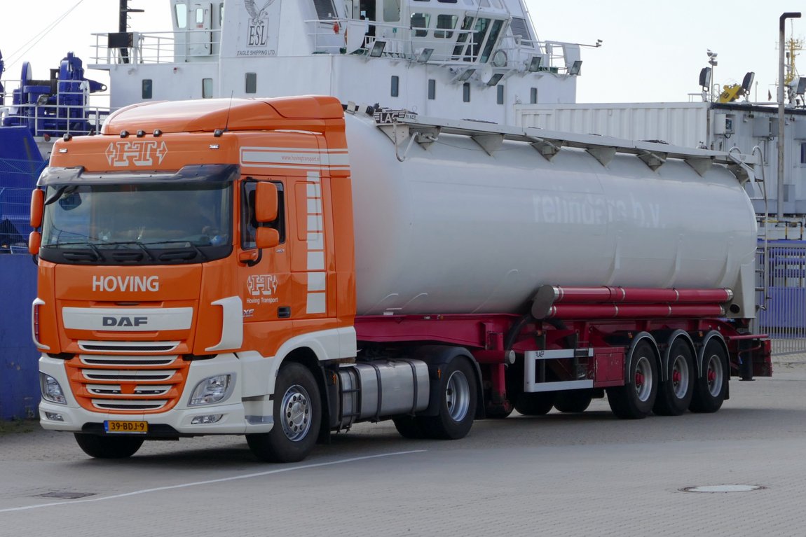 DAF XF Euro 6 460 von "Hoving" mit ehemaligen Reijnders Kippsilo, 2016 an der damaligen Elbefähre in Cuxhaven.