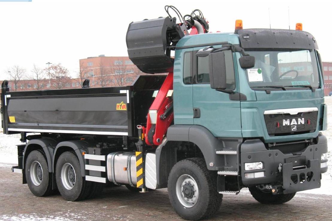 Hier einen MAN TGS 6x6 mit HMF 1643 Z Kran und Bakker 450 liter Greifer.