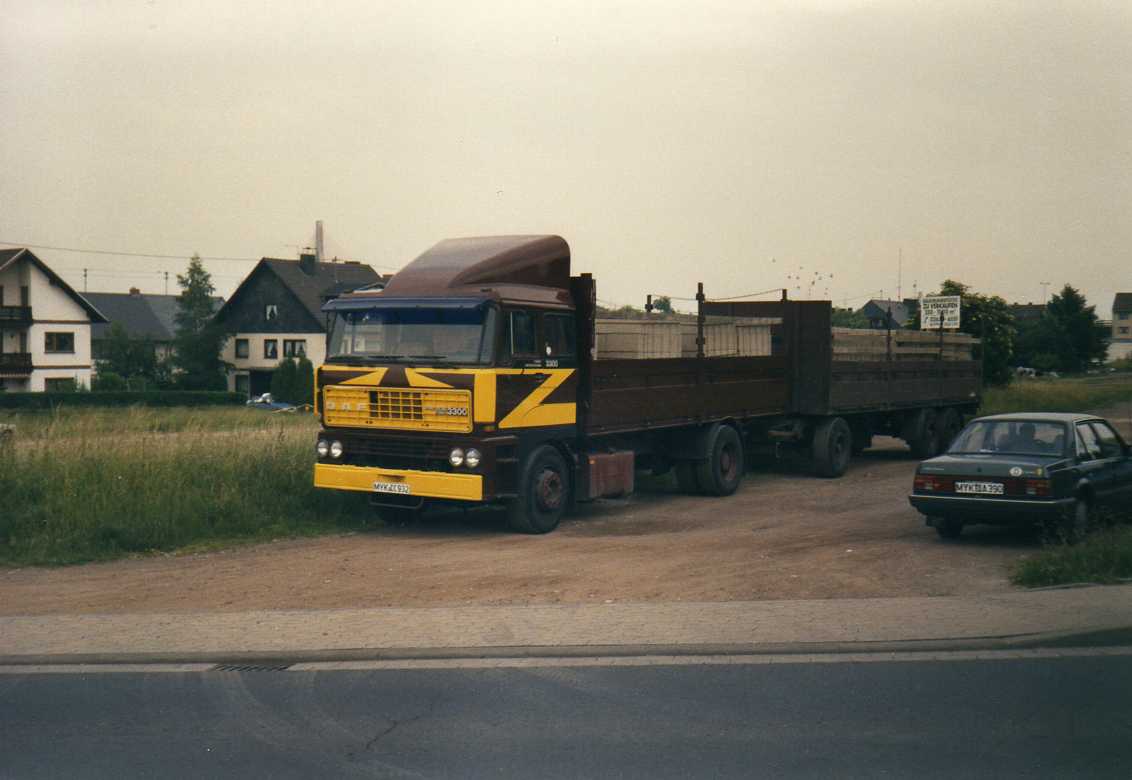 hier zwei Foto's von DAF Lkw's.Einmal die Spedition Rausch aus Weißenthurm mit einem 3300 "33er" Planhängerzug und einmal die Firma Rünz & Hoffend aus Urmitz/Rhein mit einen 2800 "28er" mit kurzer Kabine als Kranhängerzug.