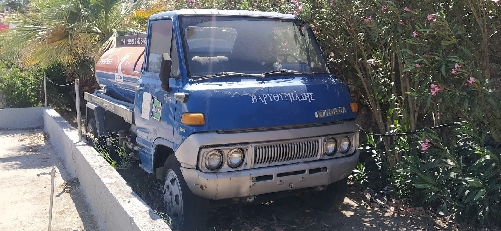 Inzwischen ein waschechter Oldtimer aus Anfang der 70er Jahre: Toyota Dyna U10 als Tankwagen einer Tankstelle auf einer kleinen Insel. Gesehen in Griechenland im Jahr 2022.
