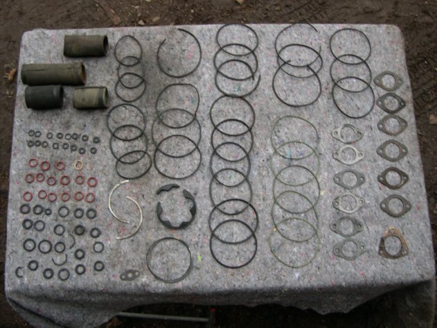 Angefangen, die festsitzenden Schrauben aufzudrehen (einge sind dabei auch abgerissen, z.B. alle Befestigungsschrauben von den Abgassammelrohren am Turbolader) habe ich im Herbst 2008, immer mal wieder am Wochenende 3-4 Stunden. 2009 ging´s relativ unregelmässig weiter und dieses Jahr Sommer hatte ich dann alle Vorbereitungen für "die OP am offenen Herzen" abgeschlossen (u.a. habe ich eine Reparaturanleitung für den Motor organisiert und auch schon die ersten Dichtungen bestellt), so dass ich diesen Sommer mehrere Wochen täglich 8-10 Stunden an der Raupe geschafft habe. Alles in allem grob über den Daumen gepeilt in den vergangenen drei Jahren 500-600 Stunden, wobei sicher die Hälfte dieses Jahr war. Die ausgetauschten Dichtungen seht ihr auf dem letzten Bild.
