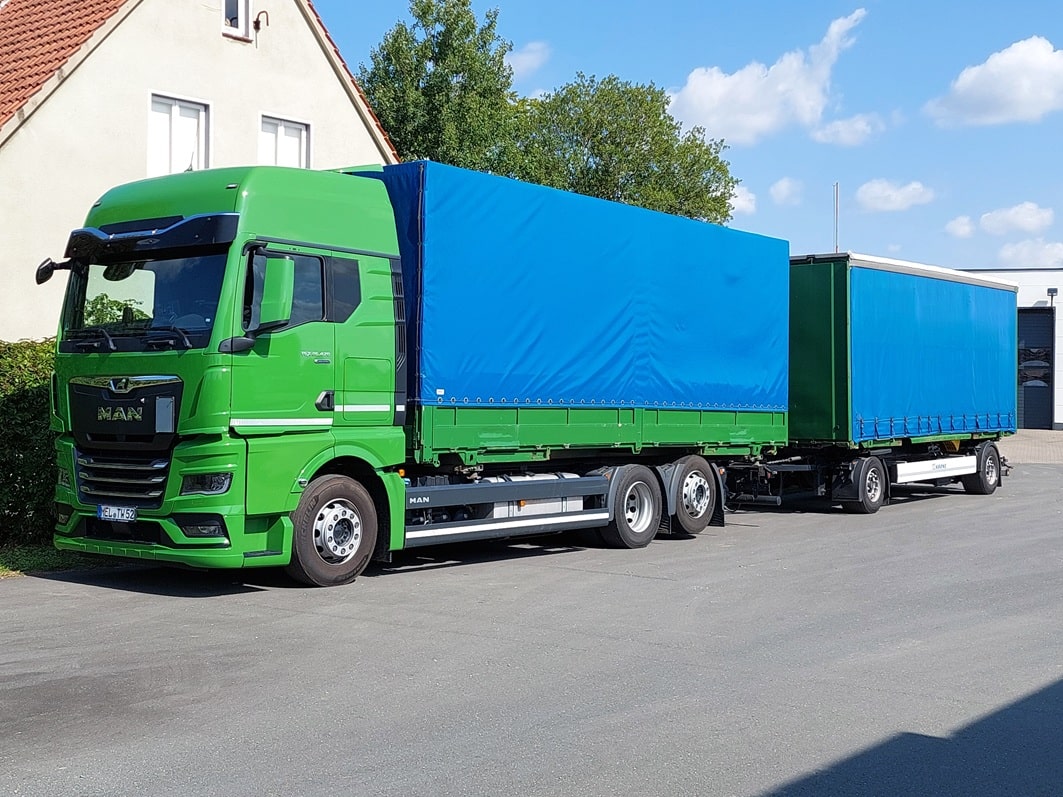 Actros Gliederzug , leider ohne jegliche Planenbeschriftung . Sieht irgendwie ein bisschen nackt aus .