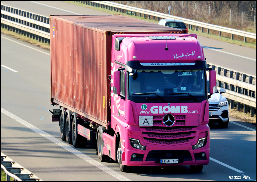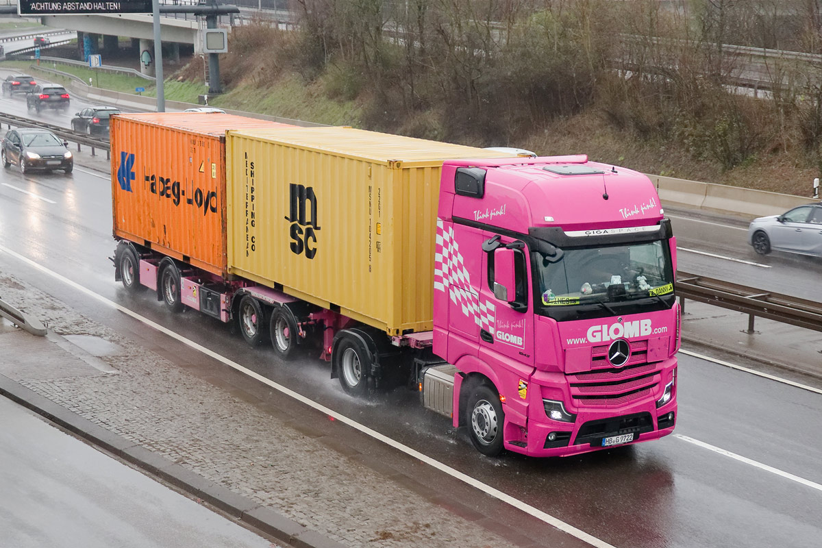 Mercedes Actros MP5 im gewagten Farbkleid der Container-Spedition Glomb.