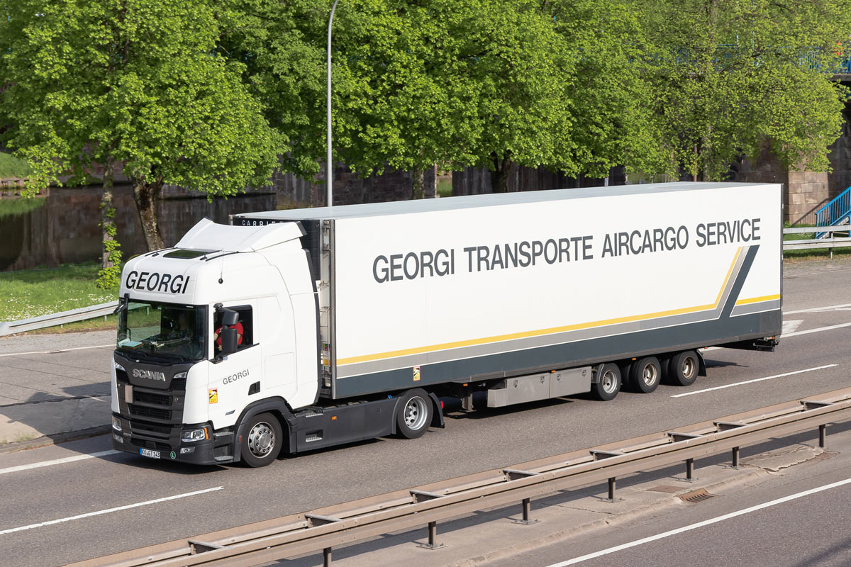 Ungewöhnliches Fahrzeug bei Georgi, ein Scania ohne Streifen und mit Koblenzer Kennzeichen, ntweder ein Sub oder ein Dauertestwagen von Scania (Saarbrücken, 2025): |
