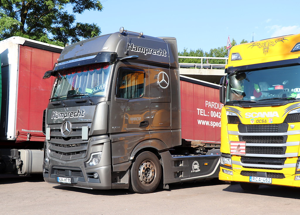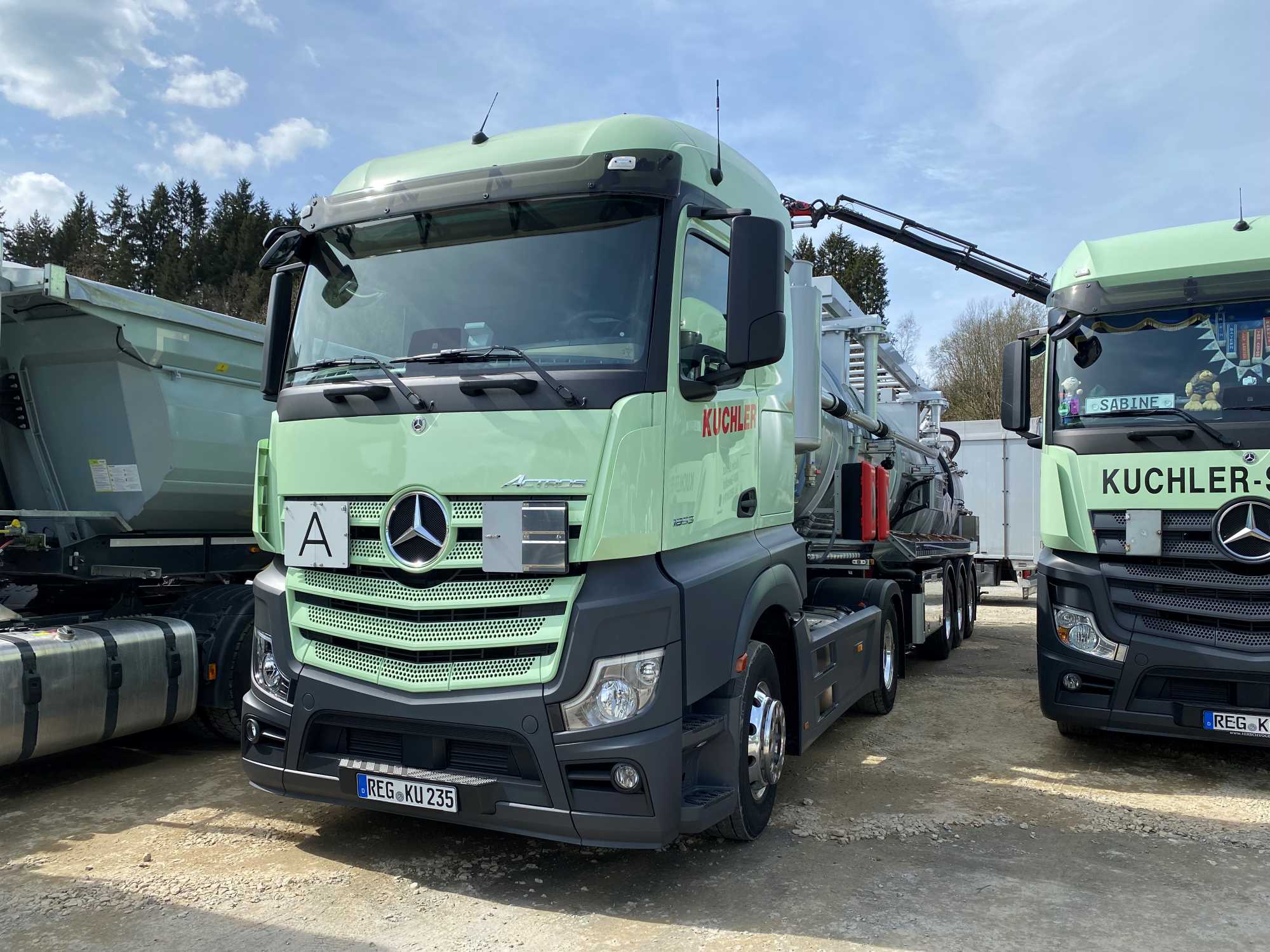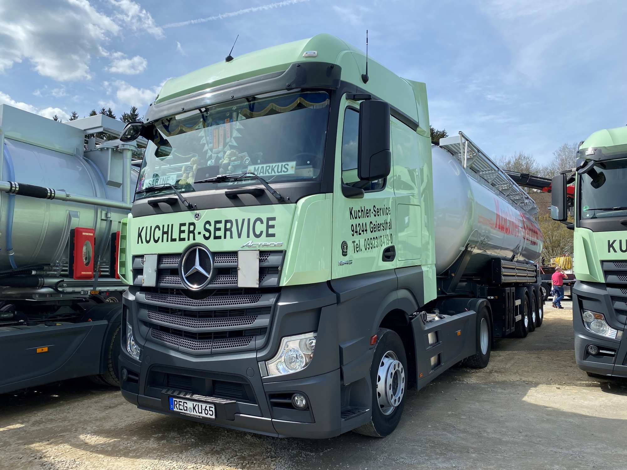 diverse Mercedes-Benz Actros von der Fa. Kuchler, aufgenommen in Teisnach bei einer Fahrzeugschau anlässlich des 70jährigen Firmenjubiläums im April 2023
