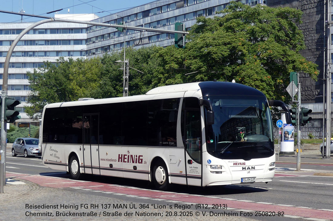 Reisedienst Heinig FG RH 137 MAN ÜL 364 “Lion´s Regio” (R12, Baujahr 2013) am 20.8.2025 in Chemnitz.