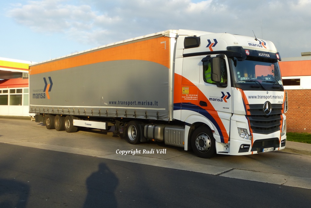 im April 2016 konnte ich diesen Actros BigSpace1845 MegaPritschensattelzug von Marisa auf der Raststätte Aachener Land fotografieren.