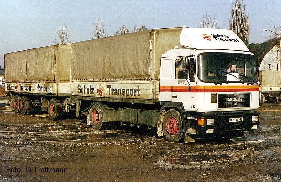 Auf den Bordwänden des Anhängers trug er die selten anzutreffende Beschriftung der Hamburger Scholz Niederlassung.