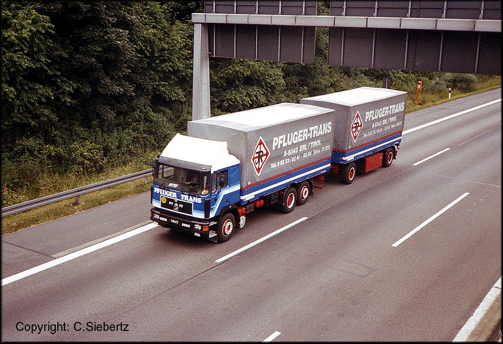 Das Motiv zeigt einen F90 Planenhängerzug des in Erl in Tirol ansässigen Transportunternehmen Pfluger-Trans.