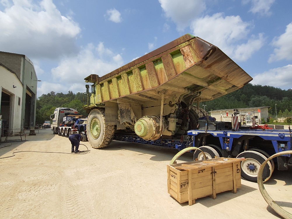 Für dieses Transport war es wegen die Transporthöhe notwendig um die aufgeschweiste Erhöhung an die vordere Seite von dem Mulden über das Fahrerhaus und Motorhaube herunter zu schneiden , das haben wir am Montag gemacht , zusammen mit das Lösen von die meisten Radmutter , damit am Dienstag die Verladung am schnelsten verlaufen konnte .