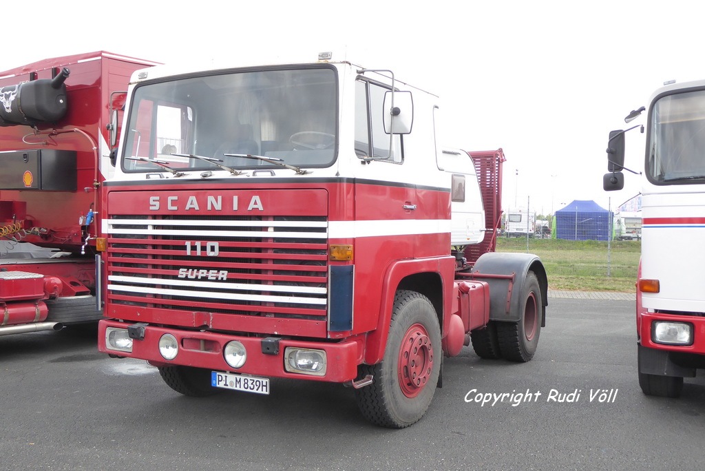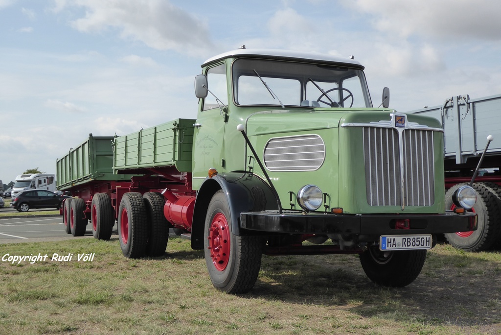 So, genug der Worte für den Anfang, ein paar erste Bilder habe ich auch schon vorbereitet. Los geht es mit ner sehr originalen Scania LB110 Sattelzugmaschine in erster Hand, einem mir natürlich besonders gefallenden (siehe mein Avatar-Bild) Mercedes LPS1632, der im Gedenken an seinen ehemaligen Besitzer im Trucker-Outfit der 80er Jahre erhalten wird, eine Magirus-Deutz 320D26FS Sattelzugmaschine, die wohl Behörden-Vergangenheit hat, ein bei mir Jugenderinnerungen weckendees Iveco-Turbostar-Päärchen, ein weißer 480er und ein grauer 420er, beide mit dumpf bollernden V8 und mit der wohl kürzesten Anreise eine IFA S4000-1 Zugmaschine aus Oschersleben.