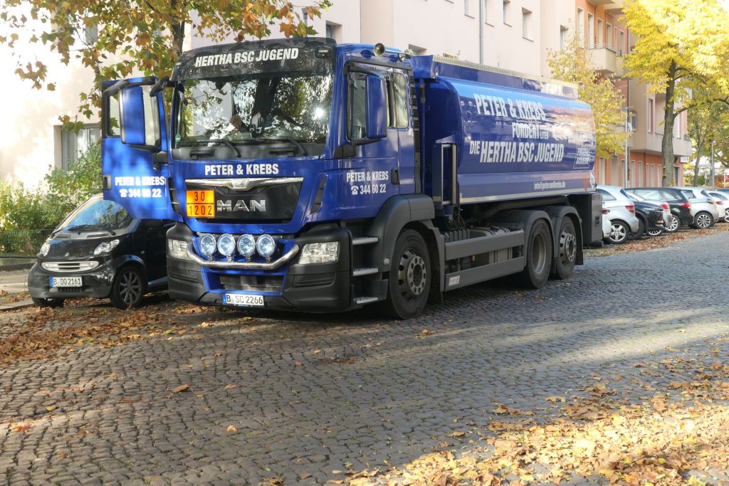 M.A.N. TGS, 26-Tonner, von Peter & Krebs, mit Hertha BSC-Werbung, gesehen in Berlin-Reinickendorf