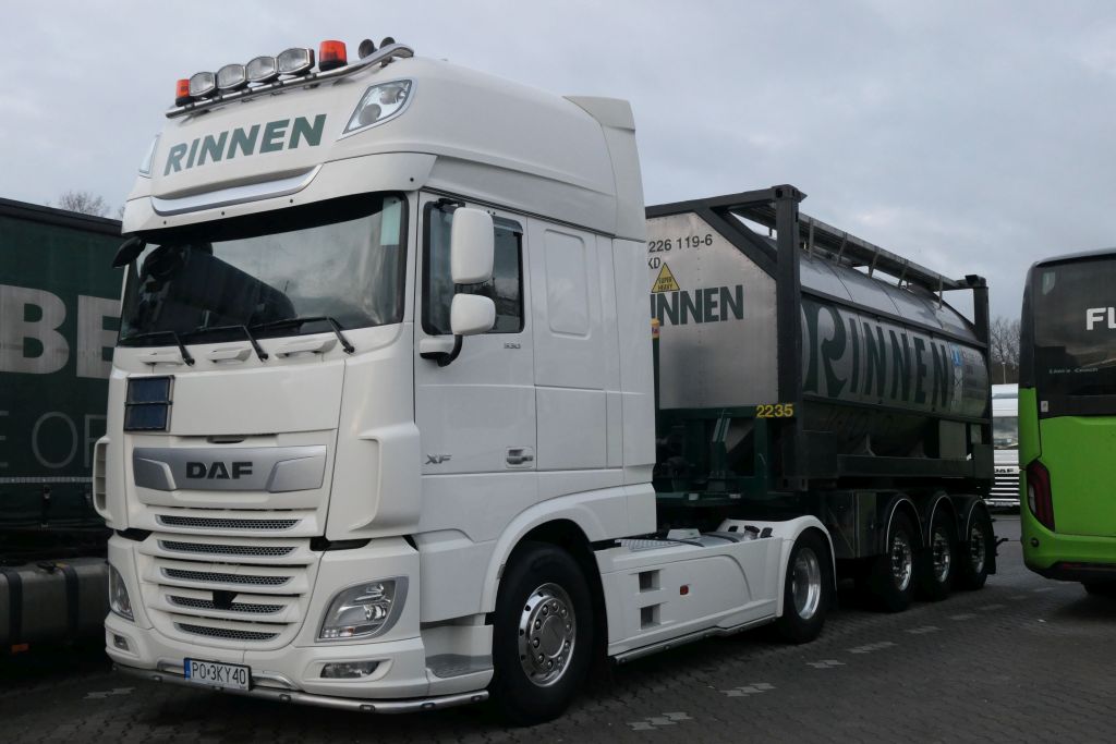 DAF XF 530 Euro6 SSC Tankcontainer-Sattelzug von Rinnen-Unternehmer mit polnischer Zulassung, der jedes Wochenende auf dem AVUS-Parkplatz in Berlin steht.