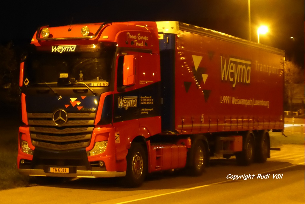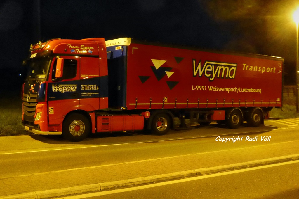 im Belgischen Marche-en-Famenne konnte ich dank guter Straßenbeleuchtung diesen Actros Bigspace 1951 Pritschensattelzug von Weyma aufnehmen, obwohl es im April 2022 kurz vor 23 Uhr abends natürlich längst dunkel war.
