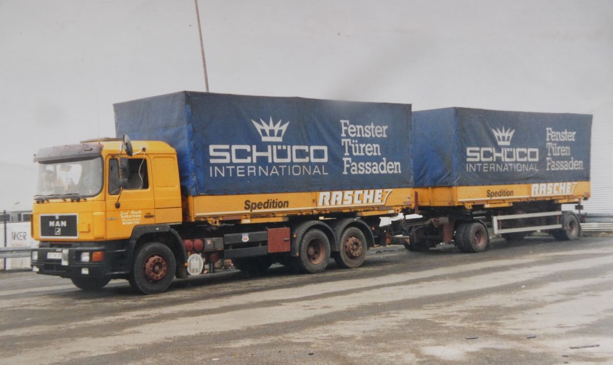 Vor fast auf den Tag genau 30 Jahren wurde der F90 19.372 in München direkt abgeholt. Er lief dann bis 1998 und wurde gegen einen fast identischen F2000 ersetzt. Das erste Bild ist bei der Übergabe in München (der Inhaber der Firma, der Verkäufer und der stolze Fahrer v.l.n.r.)