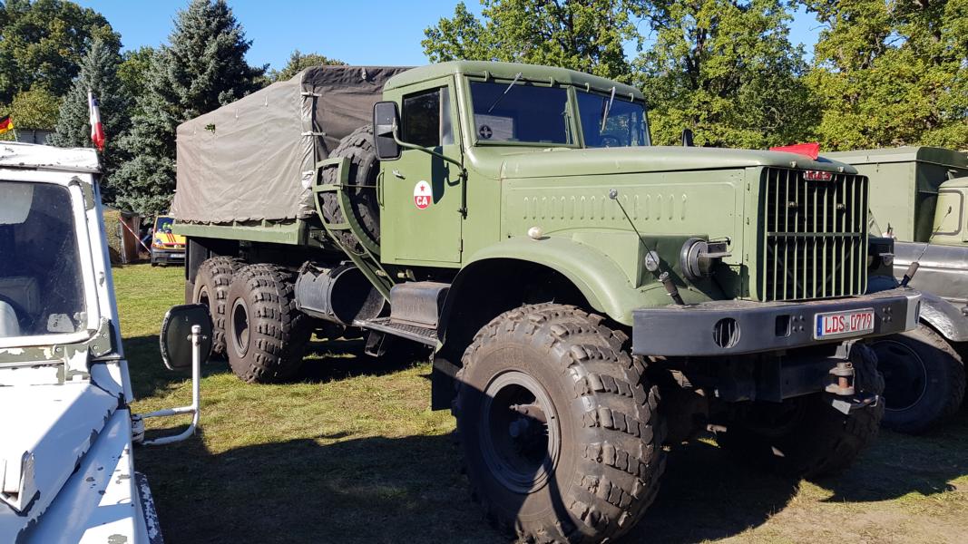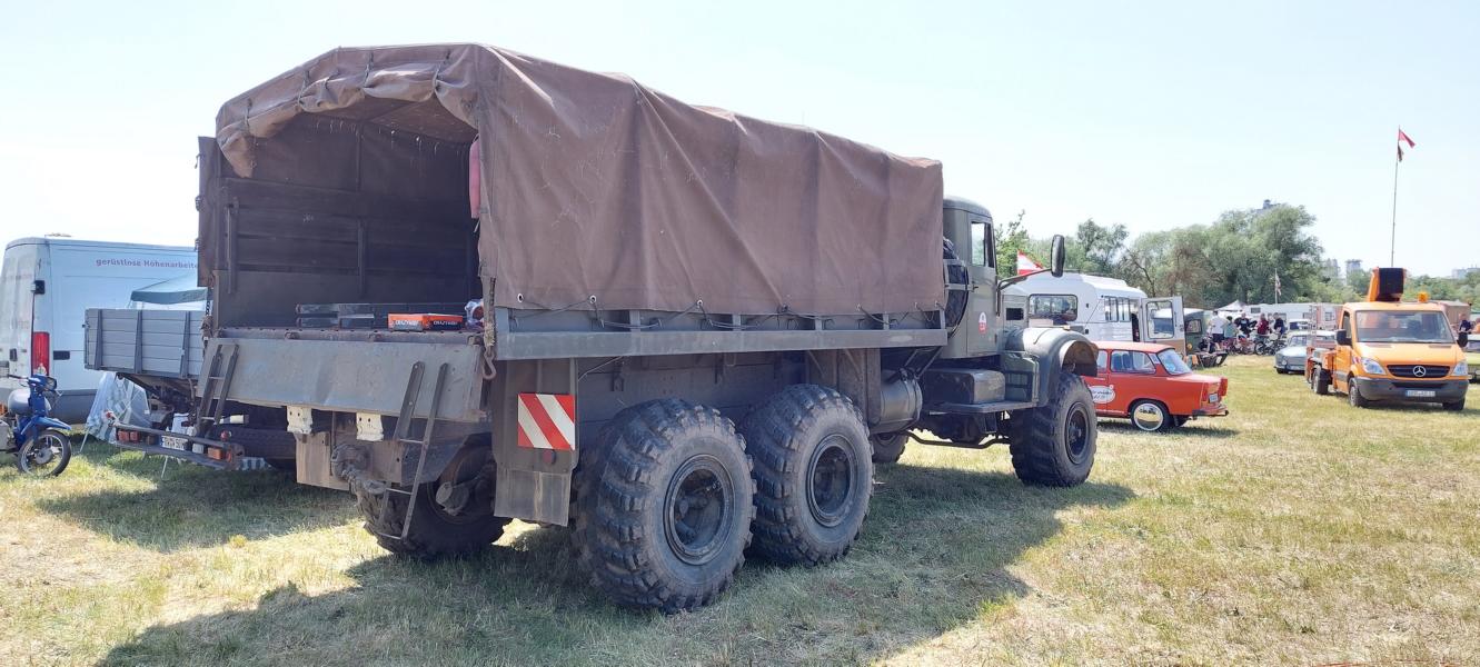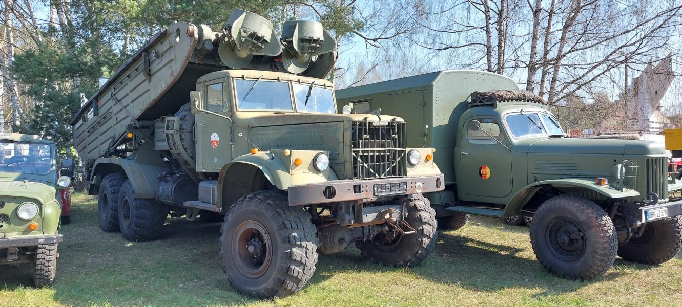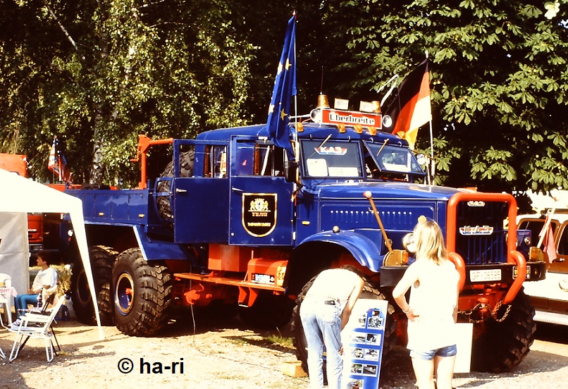 Links KrAZ 255B1 mit Bugsierboot BMK-T, rechts Hydraulik-Autobagger 4421 auf dem Fahrgestell E305 W