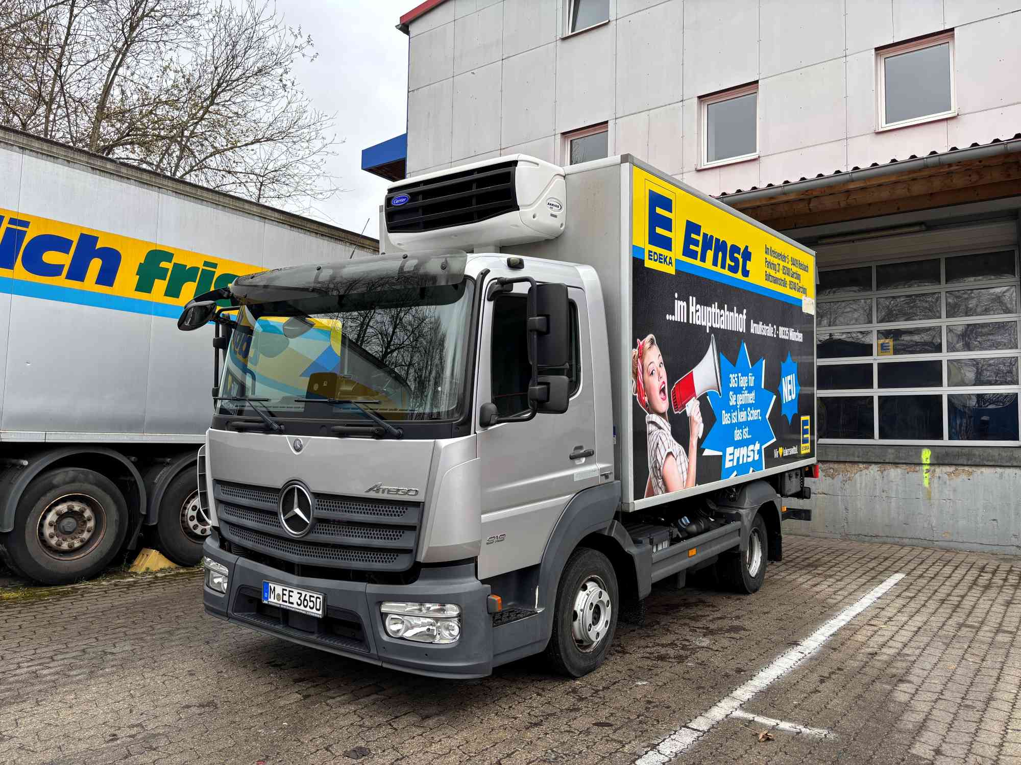Mercedes-Benz Atego 818, fotografiert in München - Freimann. Dieser kleine MB gehört nicht direkt der EDEKA, sondern der Fa. Ernst die Oberbayern und Niederbayern (u.a. am Münchner Hauptbahnhof) mehrere Edeka-Märkte betreibt