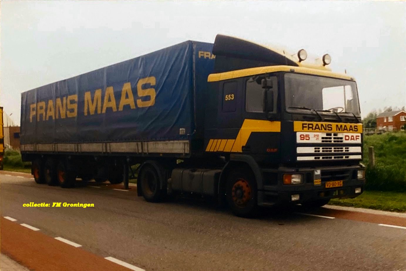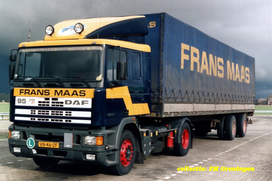 Es muss Mitte der neunziger Jahre gewesen sein, als dieses Foto von diesem DAF 95 ATI 310-Sattelzug mit Auflieger von Frans Maas Groningen aufgenommen wurde. jo