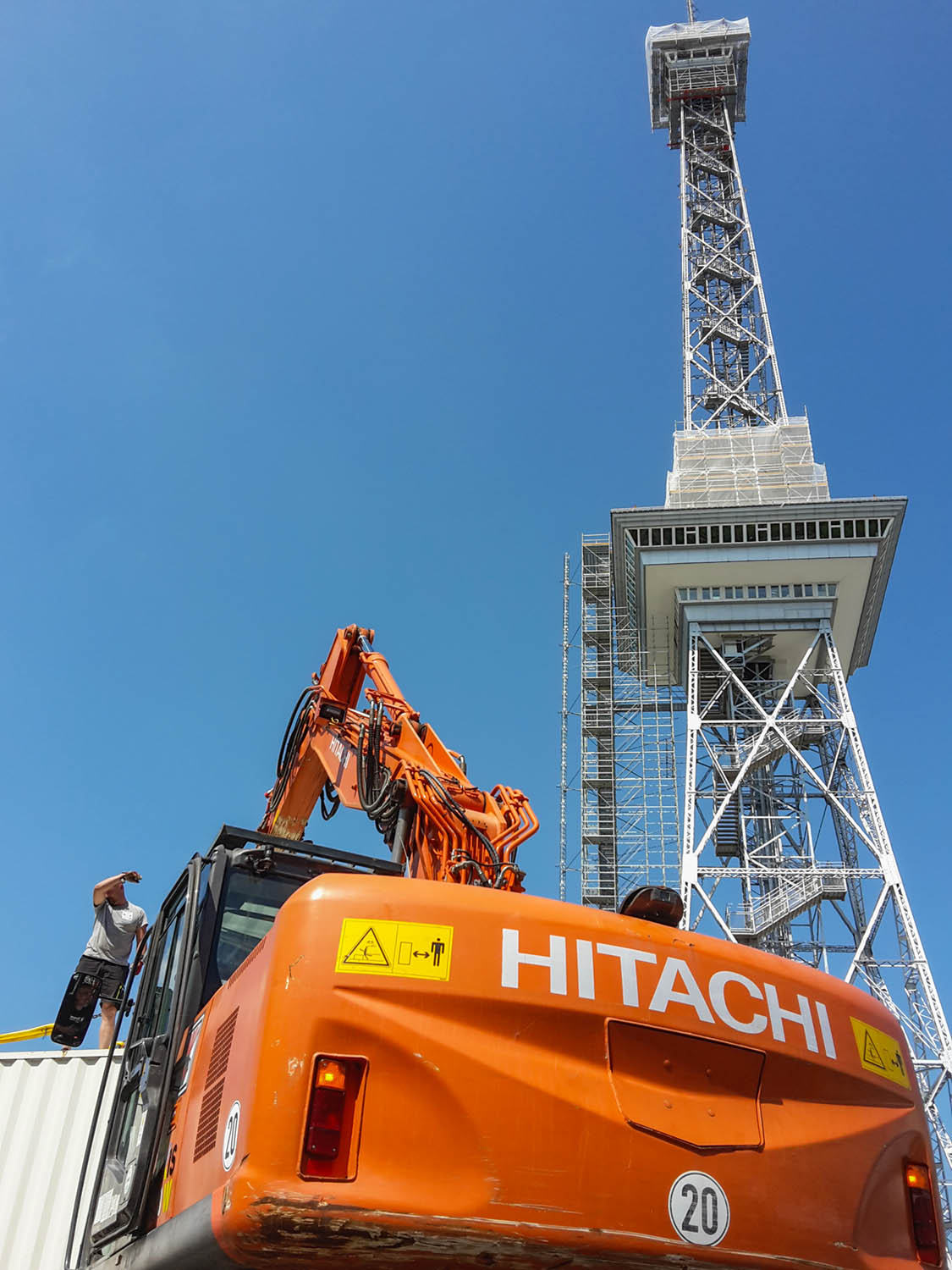 Auch der Funkturm geht mit der Berliner Mode und trägt Baugerüst.