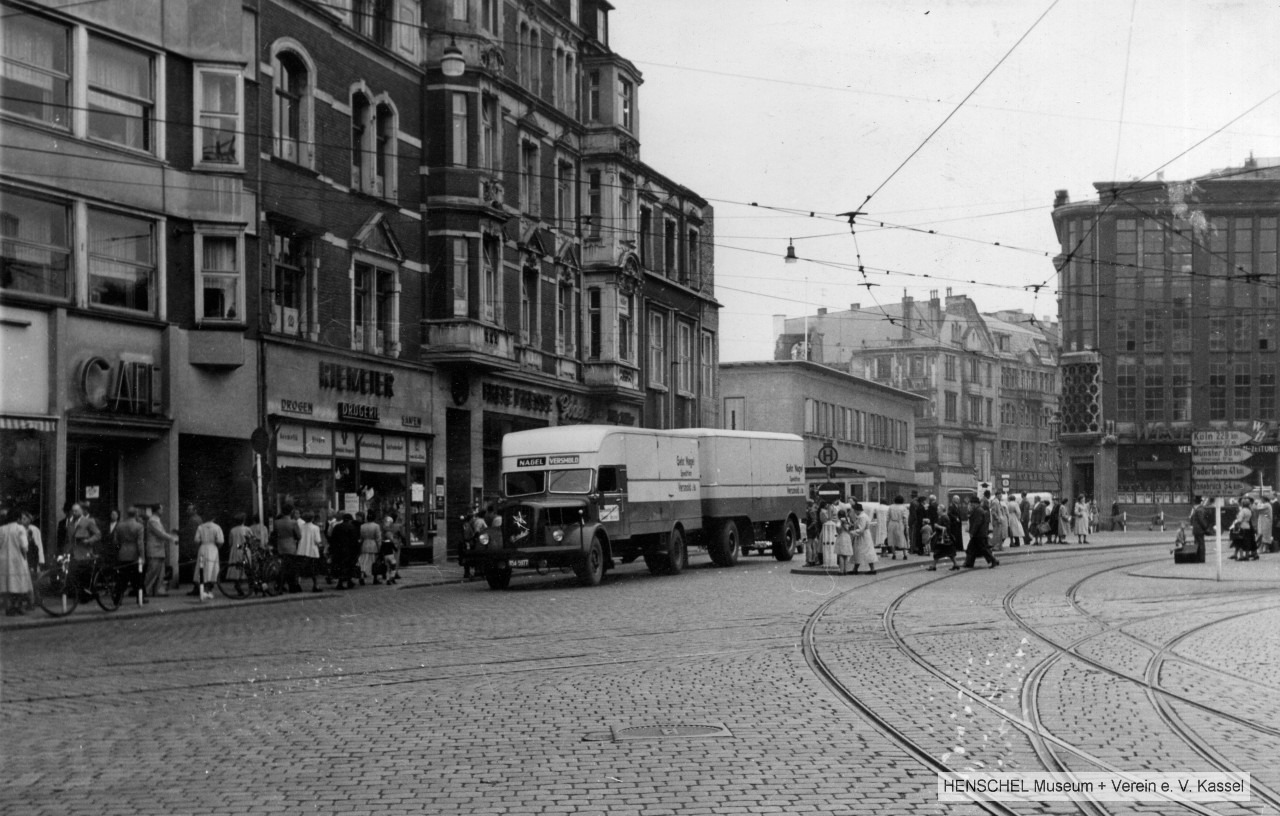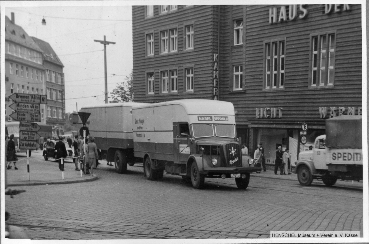 Eben ist mir im Fundus des HENSCHEL Museums, wie immer auf der Suche nach was anderem, dieses Foto aufgefallen, weil es einen HENSCHEL HS 140 in der ganz frühen Ausführung, ca. 1951, mit Kofferaufbau und Anhänger der Gebr. Nagel zeigt. Vielleicht kann jemand erkennen, wo die Aufnahme entstand hmm