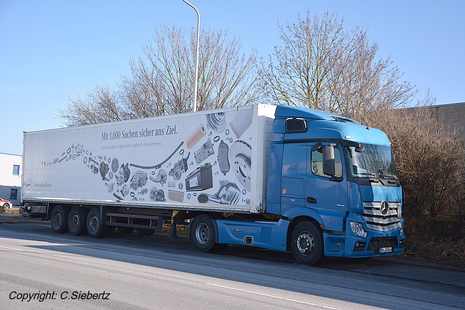 Oftmals auch noch mit unbedruckten Planenaufliegern, trägt dieser im Februar 2022 aufgenommene Actros 1845 wenigstens noch einen bedruckten Kofferauflieger vom Mercedes-Benz Teileservice.