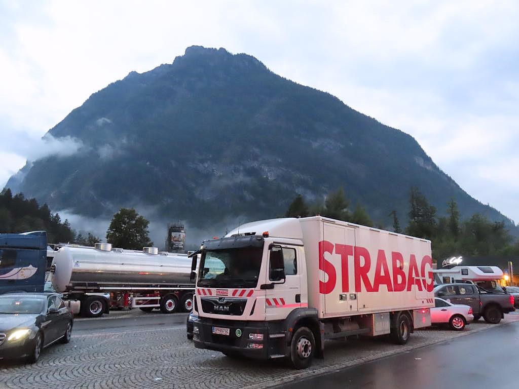 August 2025... Raststation Golling West an der A 10 in Österreich. MAN TGM von der Strabag AG. Wie hat es Walter so schön beschrieben auf der Seite 170 hier im Thread.... Morgendliche Stimmung inklusive der Nebelreste aus dem Bluntautal.... daumen prost