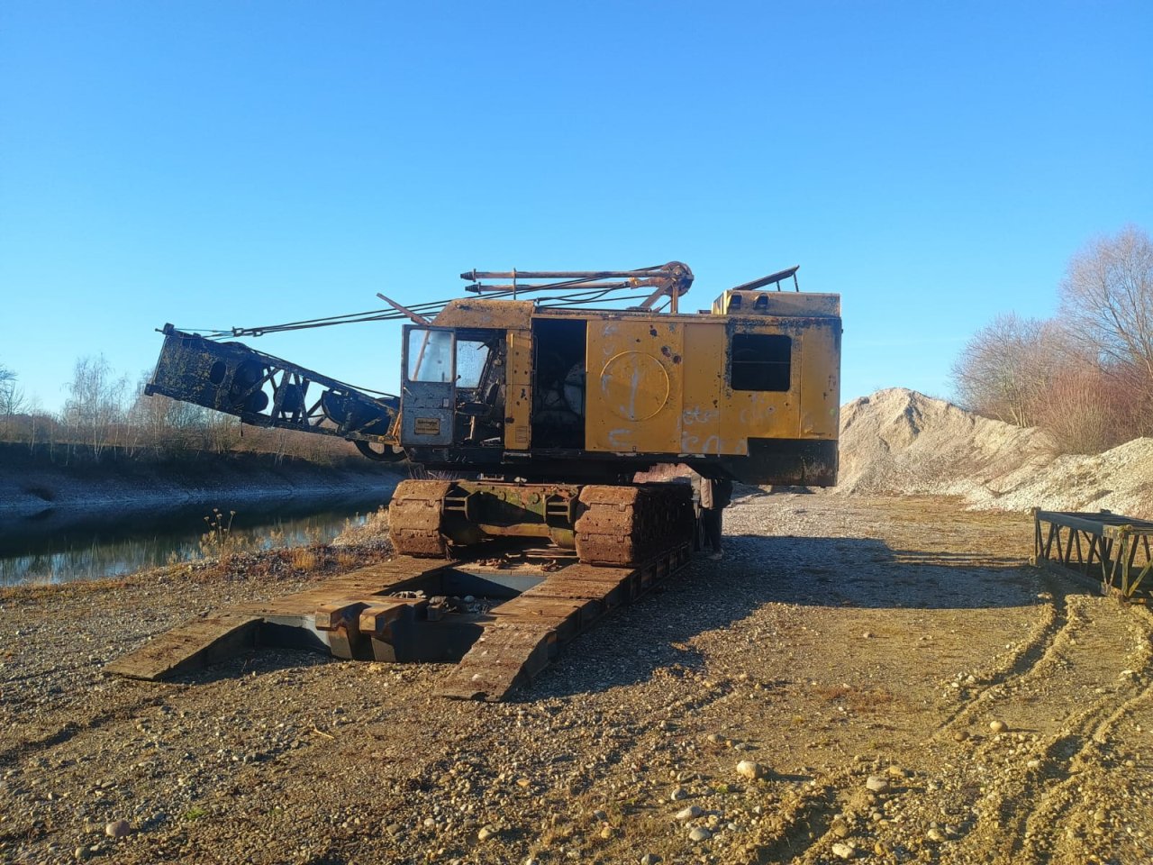 Ankunft am Ziel. Hier wird der Bagger jetzt in den kommenden Monaten für weitere Einsätze in der Kiesgewinnung vorbereitet.