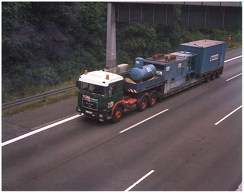 hier eine ältere Aufnahme der Kahl Schwerlast GmbH. Obwohl schon 1988 nach Moers-Repelen umgezogen, trägt dieser M.A.N F8 noch den Duisburger Standort auf der Kabine. Beladen ist der Scheuerle 3-achs Tieflader mit diversen Aggregaten des auch schon nicht mehr existierenden Preussag Konzerns.