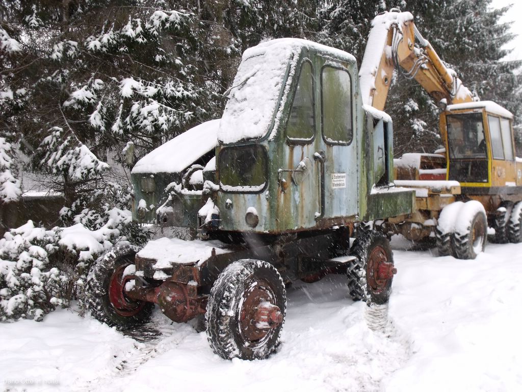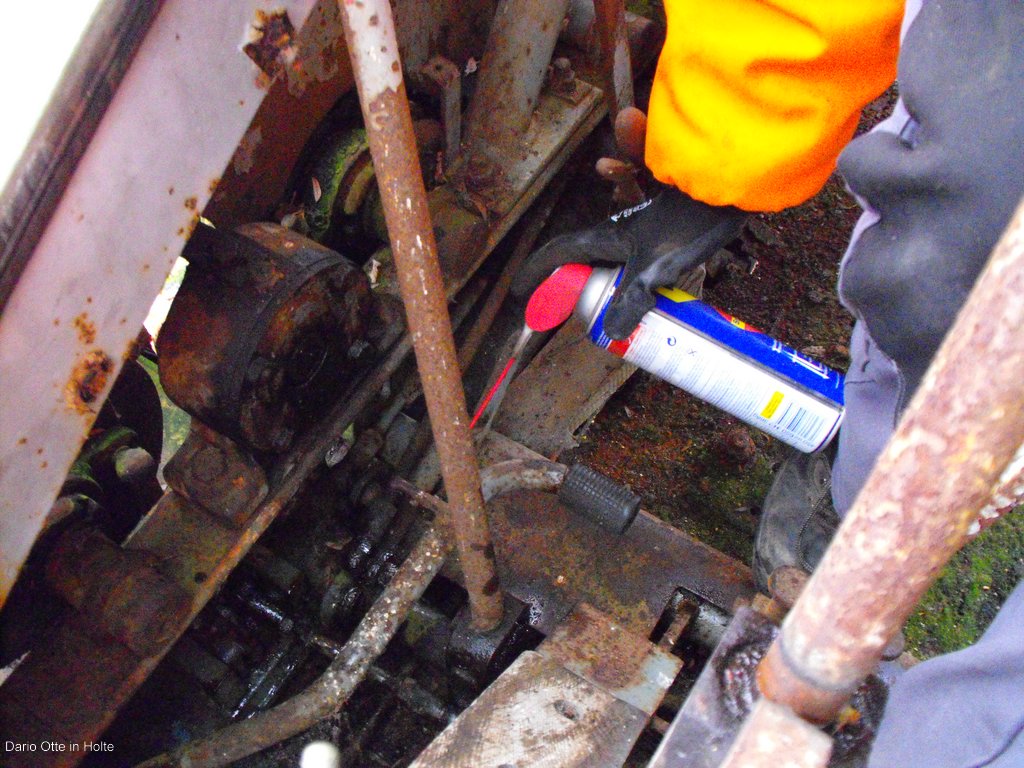 Nach einer Halben stunde fahrt erreichen sie ihr Ziel. Der nette Besitzer öffnete uns das Tor und wir begannen sofort zügig mit unserer Arbeit. Dario öffnete alle klappen, Ralf machte sich über den Motor her und ich versuchte die etwas festgegammelte Hebelei wieder gangbar zu machen. Nachdem Ralf den Ölstand kontrollierte und eine frisch geladene Batterie angeschlossen hatte gab er mir das Zeichen einen ersten Startversuch zu unternehmen. Also ich glühte vor und lies den Motor drehen. Der Magnetschalter am Anlasser benötigte zwei drei gezielte Hammerschläge und dann fing er an den Motor zu drehen. Nach ca 1 Minute brachen wir diesen Versuch ab. Wir hatten keinen Diesel vor den Einspritzdüsen. Als erstes wurde die Hohlschraube an den Einspritzelementen geöffnet. Bis dahin hatten wir schon mal Diesel. Somit lag es an den Einspritzelementen. So und jetzt? Durch die lange Standzeit sind diese wohl fest gegammelt. Also wird versucht diese wieder gangbar zu machen. Aber dies funktionierte leider auch nicht so wirklich. Inzwischen fängt es auch an dunkel zu werden und wir waren alle drei durchgefroren. Wir packten unser Werkzeug ein und einigten uns mit dem Besitzer. Wir verblieben am nächsten Tage wieder zu kommen und den Bagger zu Bergen und somit vor dem weitern Zerfall zu retten. Auch wenn der Motor nicht in Gang gebracht werden konnte. Mit der zu versicht auf den ’’neuen’’ Bagger machten wir uns wieder auf den nach Hause weg. Beim Abendessen wurde dann besprochen wie wir den Bagger bergen wollen und machten einen Termin mit dem Besitzer aus.