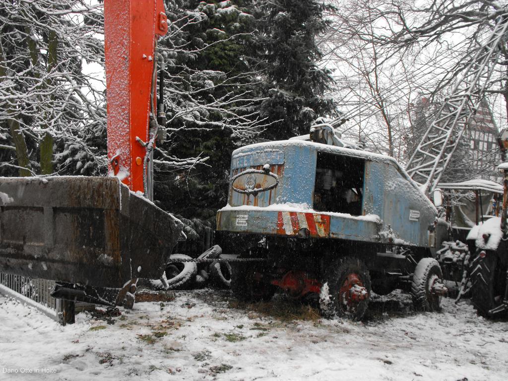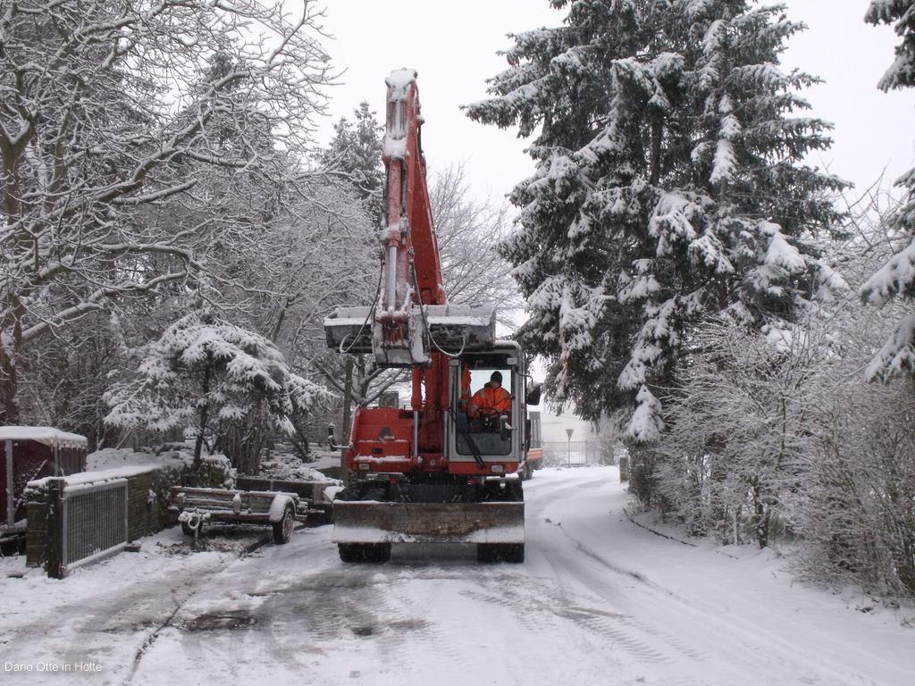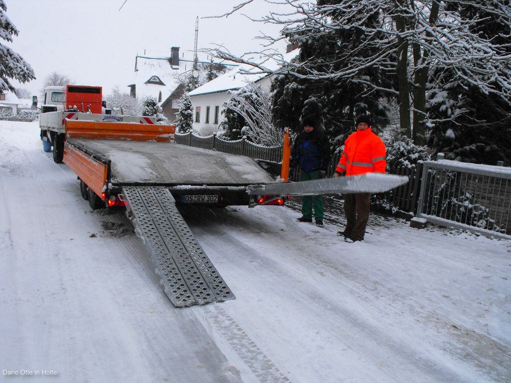 9.00 Uhr Dario starte den Atlas 1304 und lässt ihn warmlaufen. Er macht sich mit dem Bagger auf dem Weg nach Alswede. Kurze Zeit später starte Ralf mit dem 814 und Tandemtieflader. Phil welcher aus Speyer kommt unter stüzt uns heute. Ich mache mich mit ihm auch auf den Weg nach Alswede. Wir fahren wieder mit dem voll gepackten Sprinter. Auf dem hinweg kamen wir immer mehr ins Schneegestöber. Aber die trübte unsere Stimmung nur wenig auch wenn wir alle wussten das uns das Wetter nicht grade hilfreich sein wird. In Alswede angekommen ging alles ganz schnell. Den fahrbaren Kompressor abladen due Radmuttern öffnen und aus einer 8fach Bereifung mal eben eine 4fach machen. Sonst hätte er nicht auf den Tandem gepasst. Dies ging alles besser als wir erwarteten. Aber so langsam macht uns der Schnee doch sorgen es Schneit immer heftiger. Aber wer alte Bagger rettet den stört das wenig. Also weiter im Plan. Dario positioniert sich mit dem 1304 in der engen Hofeinfahrt wo der Weserwolff steht. So dann einfach eine Kette an den Unterwagen des Weserwolffes und mal ziehen. Der Weserwolff bewegt sich ohne probleme. Der 1304 lässt dich von der Last auch nichts anmerken auch wenn er etwas auf der verschneiten Strasse rutscht. Phil stieg entschlossen in den Weserwolff und versuchte den Bagger zu lenken. Aber es geschah nichts auch die Lenkung war total festgegammelt. Und das geschah es. Ein lauter Knall vorne Links platzte das Rad. Also wieder alls ausräumen und vorne eine anderes Rad drauf. Zum Glück hatte der gute Herr dem der Bagger gehörte noch eins liegen. Nachdem der Bagger dann ohne weitere Probleme auf der Straße stand hingen wir den Gittermasten ein und machten das Seil vom Ausleger los. Dario senkte ihn dann ganz feinfühlig mit dem 1304 ab. So als nächstes steht Ausleger abbauen auf dem plan. Sicherungsblech lösen und dann mal mit dem Vorschlaghammer einfach drauf kloppen und siehe da der Bolzen kam ohne Probleme. Einmal dick Rostlöser drauf sprühen den Bolzen ein paar mal hin und her kloppen und dann komplett raus. So der Ausleger ist dann auch abgebaut. Inzwischen haben wir schon nach 13Uhr, also erstmal alle in den warmen Sprinter und Mittagessen bei den Leuten mit dem großen gelben M.