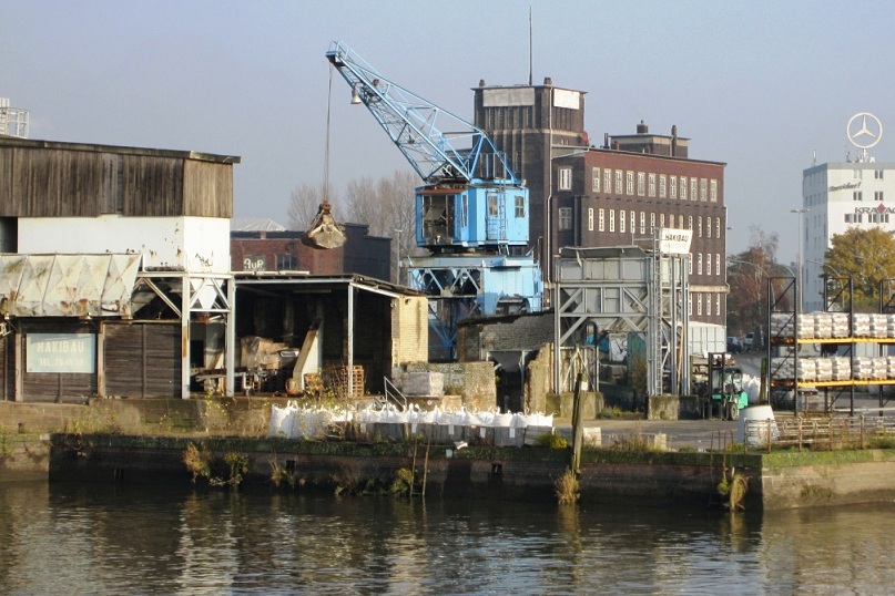 Das ist ein Nilsson&Korte Hafenkran. Steht in Hamburg. Der Nilsson & Korte Schriftzug ist am Heck des Baggers (hier im Bild nicht zu sehen). Nilsson&Korte war ein Hamburger Unternehmen, dass bis 1956 existierte.