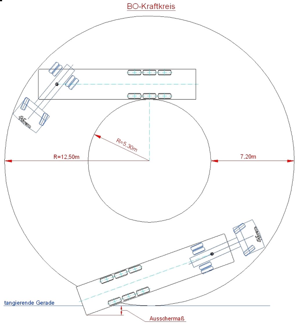 Geometrische Festlegung zum Spurverhalten von Kraftfahrzeugen und Zügen entsprechend der in der Bundesrepublik Deutschland gültigen Verordnung über den Betrieb von Fahrzeugunternehmen im Personenverkehr.