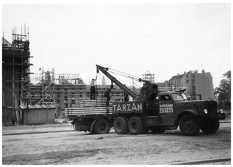 Ein weiteres Exemplar zeigt dieses historische Foto eines Diamond T der im Nachkriegs-Hamburg beim Krandienst Tarzan seinen Dienst verrichtete.