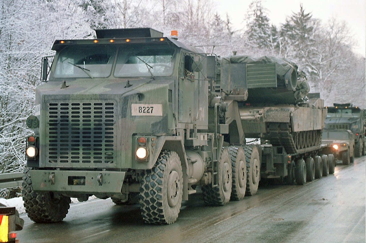Das ist ein Oshkosh M1070 HETS (Heavy Equipment Transporter System) mit einem M1000 Sattelauflieger.