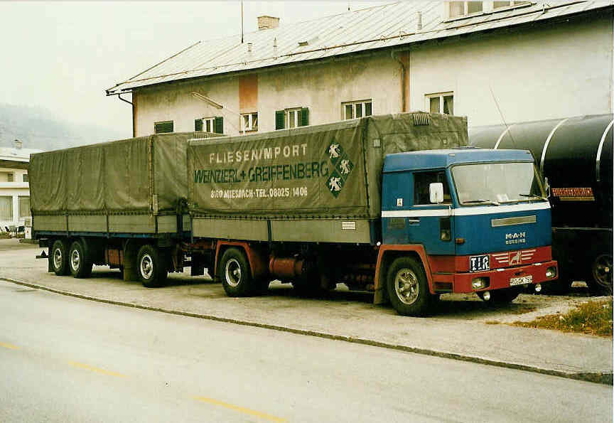 Ein weiterer Büssing, ein Büssing BS 16 S mit Zweiachs-Langmaterialauflieger, also ein 32 Tonner, 1987 fotografiert.