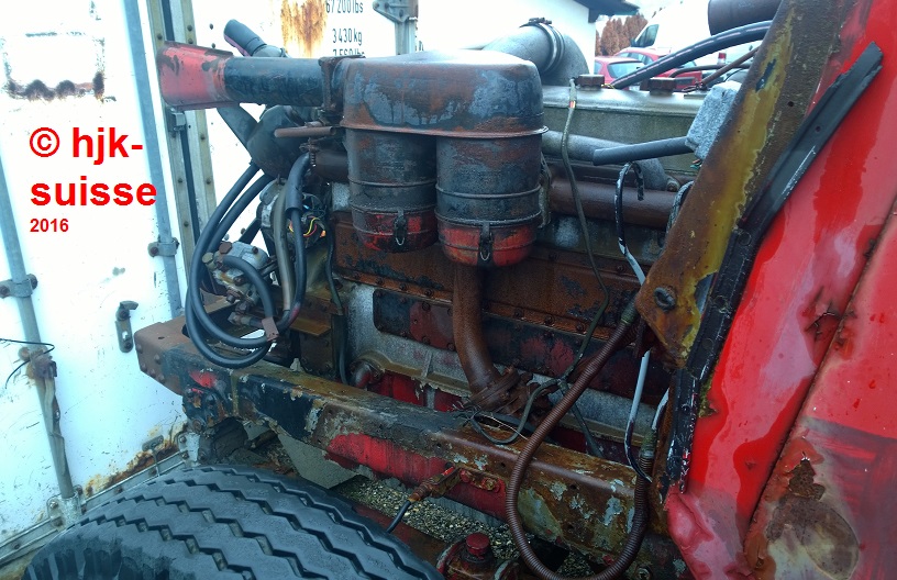 Der Motor, vermutlich ein CT2D, stammt aus einem Frontlenker. Aus diesem Grunde sind die Oelbadluftfilter links angebracht. Die Lenkhilfpumpe war ursprünglich hinter der Lichtmaschine abgebracht. Durch den Umbau auf Alternator (ohne durchgehende Welle) musste die Hydraulikpumpe mit einer Keilriemenscheibe versehen vorn befestigt werden.
