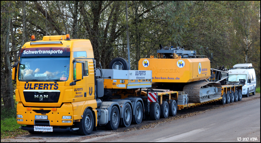 Ein MAN TGX der Firma Ulferts mit Goldhofer Auflieger und geladenem Sennebogen Seilbagger der Firma Hecker Bau.