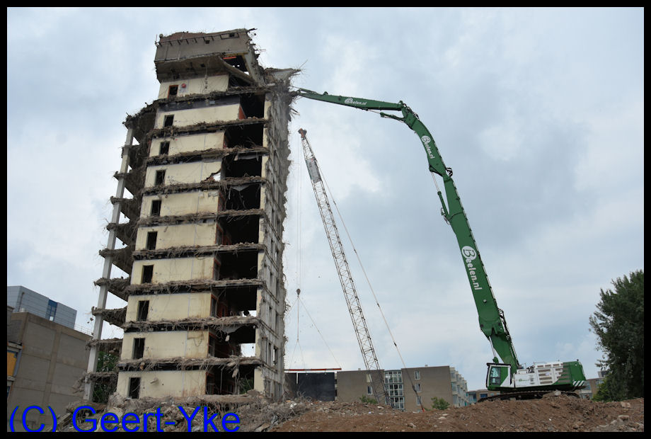 Abriss von einer Hochhaus. Ausgerustet mit NPK SV-24 XCR Abbruchzange. Der Cat 390F STC longfrontbagger ist am moment die größte Abbruchbagger der welt mit einer Umweltfreundliche Tier 4 Final motor!