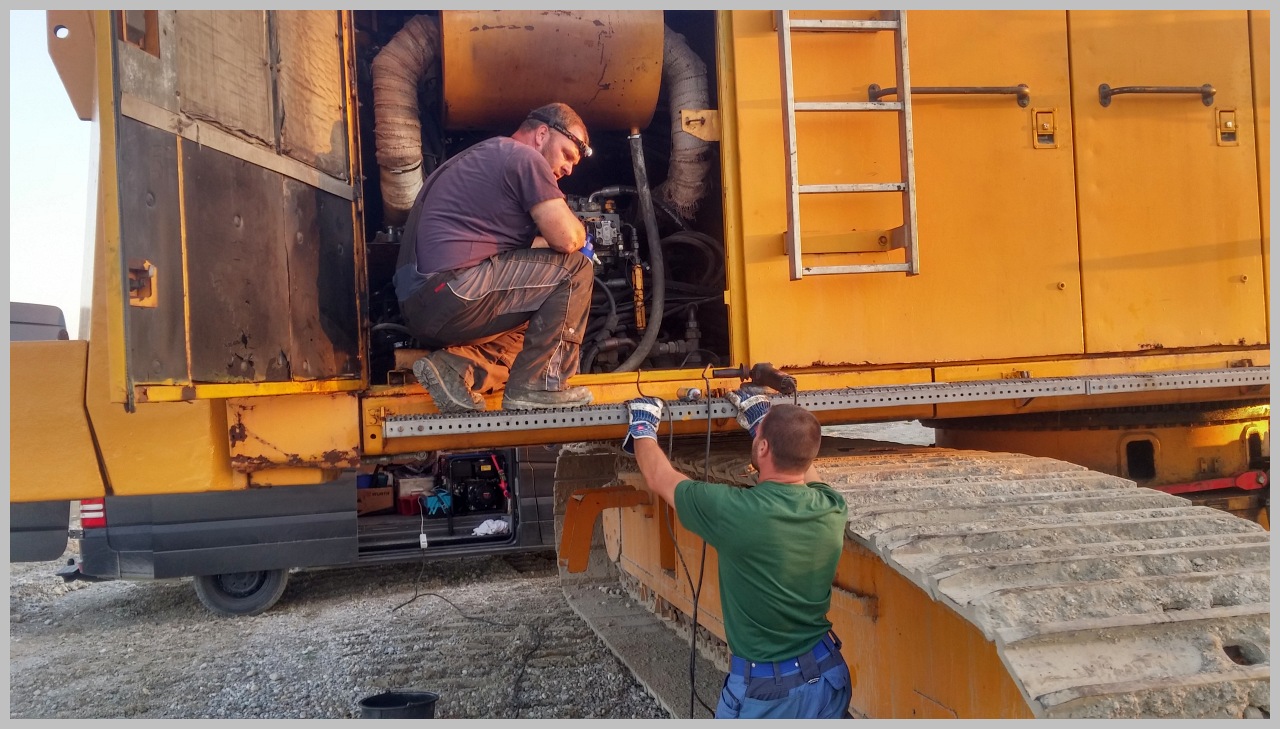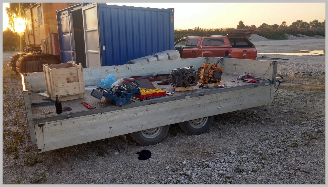 Leider hab ich kaum Fotos gemacht, war keine richtige Gelegenheit dazu... Bis die Pumpe verschraubt war, wurde es bereits dunkel und wir begannen aufzuräumen... die alte Pumpe wurde wieder in die Kiste gehoben, die geht zurück an den Liebherr und wird überholt... Stefan musste am nächsten Tag mit der No.1 Kies schmeissen und Andi wollte die weiteren Pumpen und Schläuche montieren und den Bagger einsatzklar machen.
