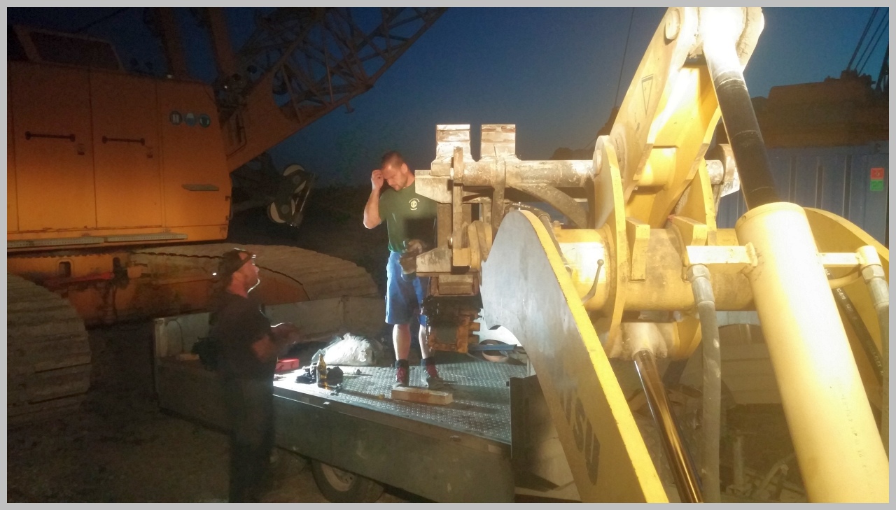 Anschließend wurde die neue, 230Kg schwere, Pumpe am Gabelträger des vom Kieswerk geliehenen Komatsu WA 75 angeschlagen und es konnte losgehen.. zum Glück war es noch einigermaßen hell.
