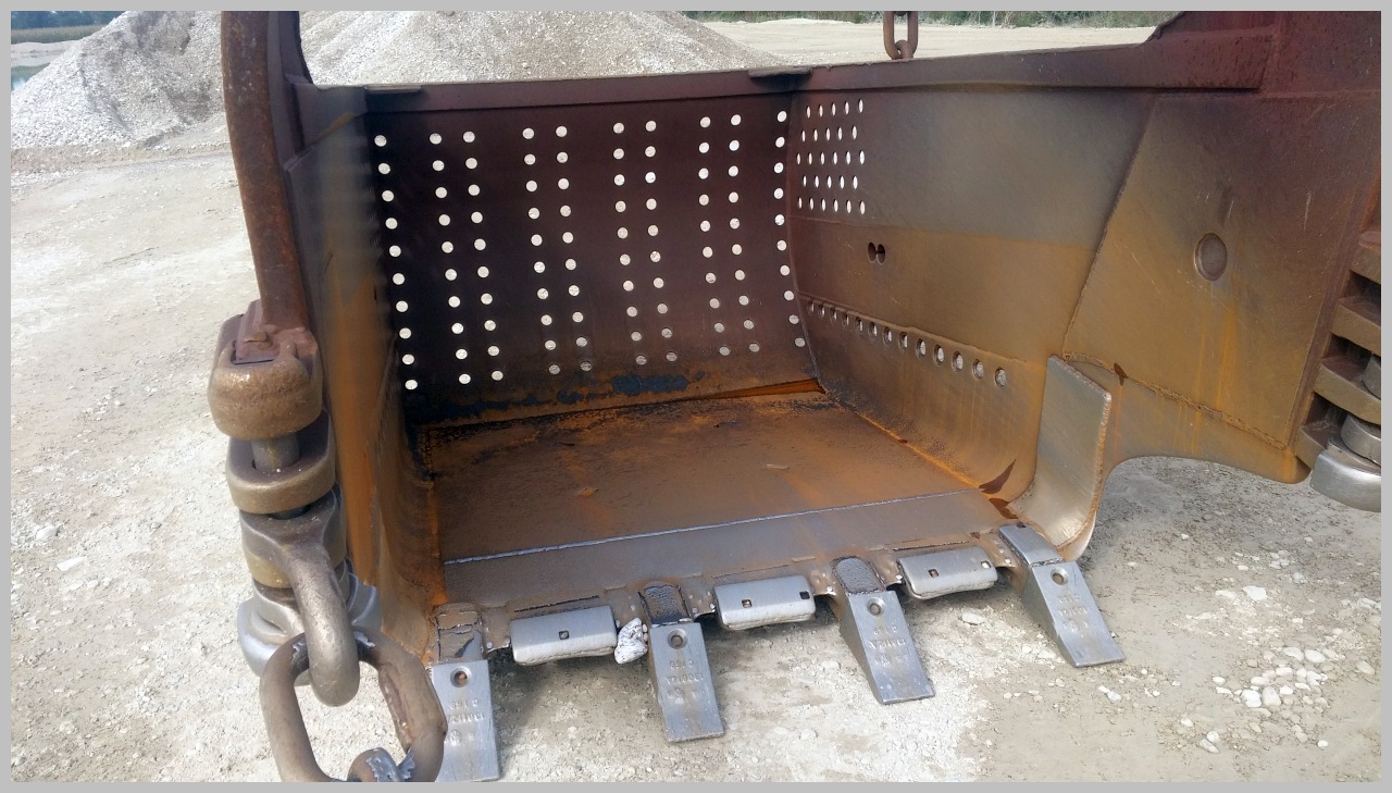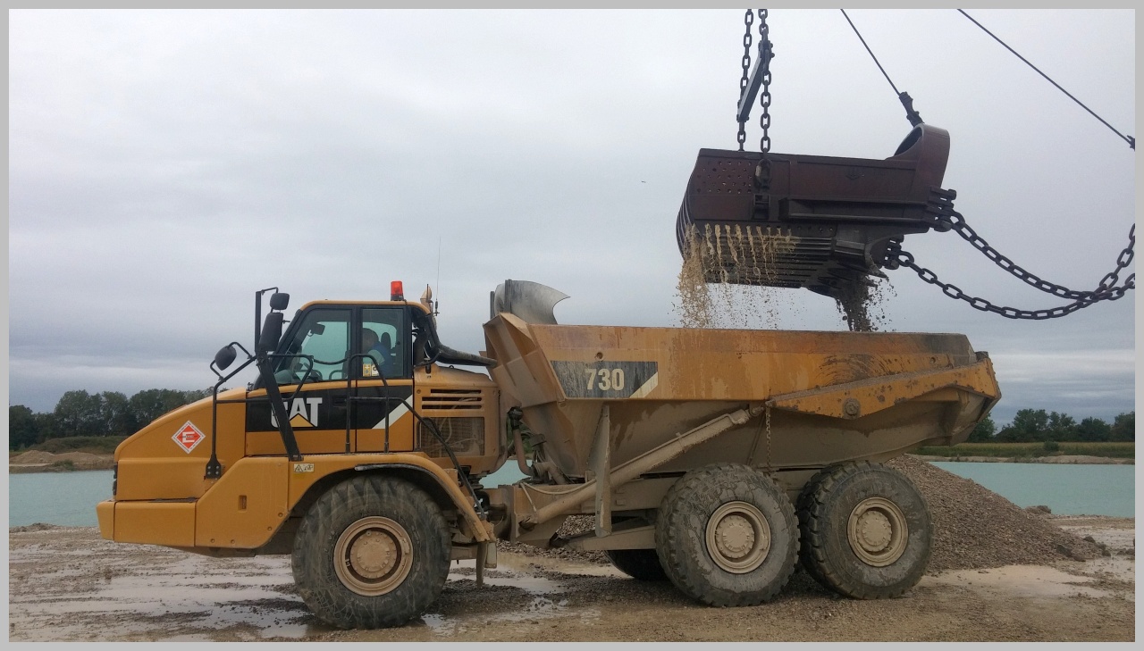 Nachdem ich und Andi kurz beieinand gestanden waren, kam auch schon der Dirk samt seinem BF3 ins Kieswerk gefahren um Ballast und Schaufel abzuholen. Nachdem der Tieflader hinter dem Bagger in Position gebracht war, ließ Andi den Liebherr an und hob den Ballast vom Boden weg. Anschließend setze der den HS883 unter Dirks Anweisungen zurück, bis der Ballast mittig über dem Tieflader hing.