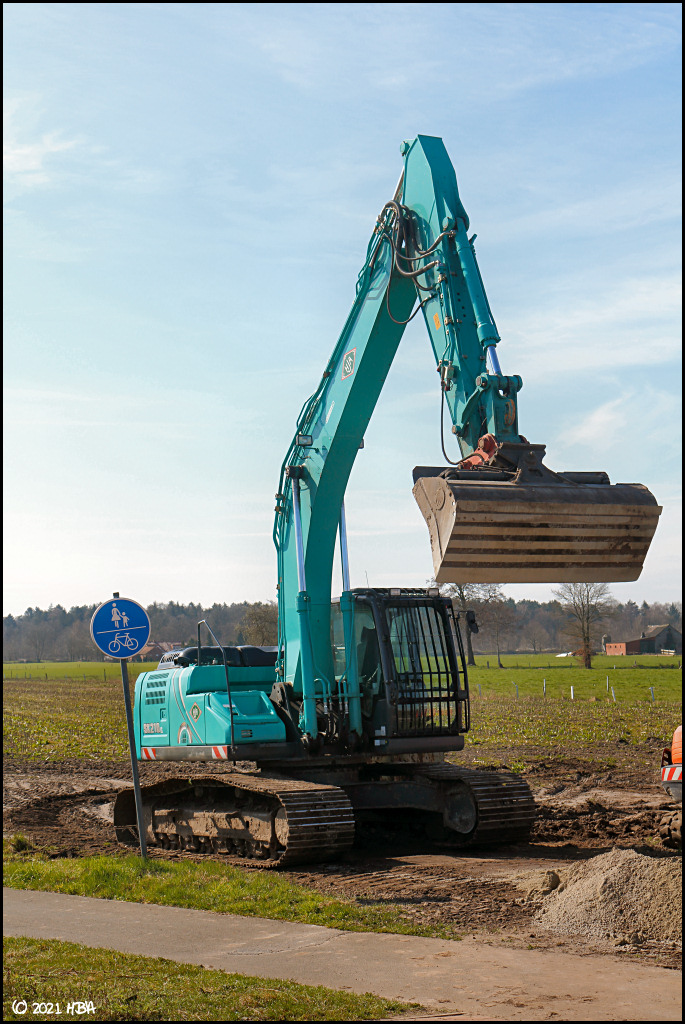 Kobelco SK210 LC der Hermann Jansen Straßen- und Tiefbauunternehmung GmbH & Co. KG beim Tausch eines Betonfertigteils an einem Durchlass in Bockhorst: