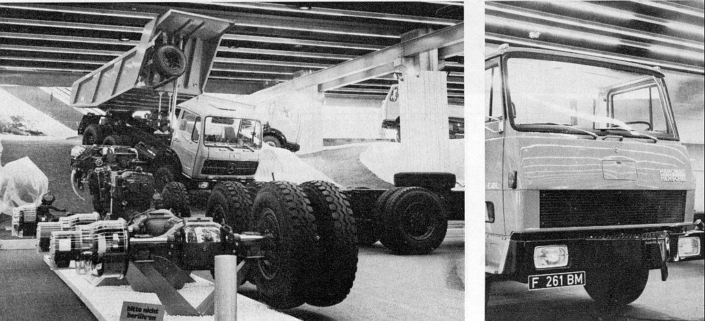 Das folgende Bild zeigt sinnigerweise einen NG-Mercedes mit einer solchen Mulde - es stammt von der IAA 1973. Auf der gleichen Seite, direkt daneben, ein Henschel F 261 BM mit dem B10-Haus, wie er noch bis weit in 1974 hinein produziert wurde. Besser kann man den zeitlich stimmigen Zusammenhang zwischen Jet-Mulde und B10-Haus kaum demonstrieren: