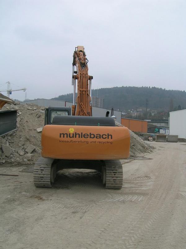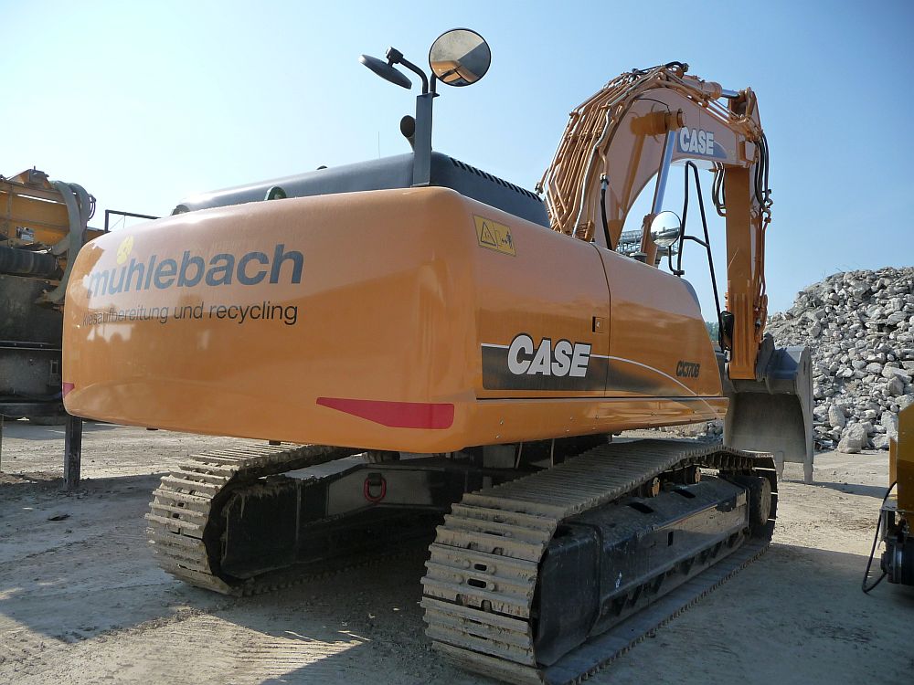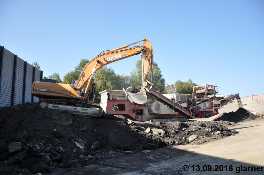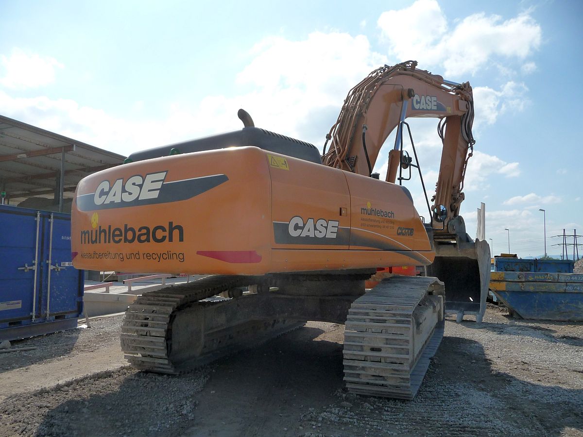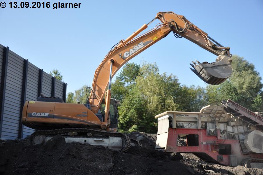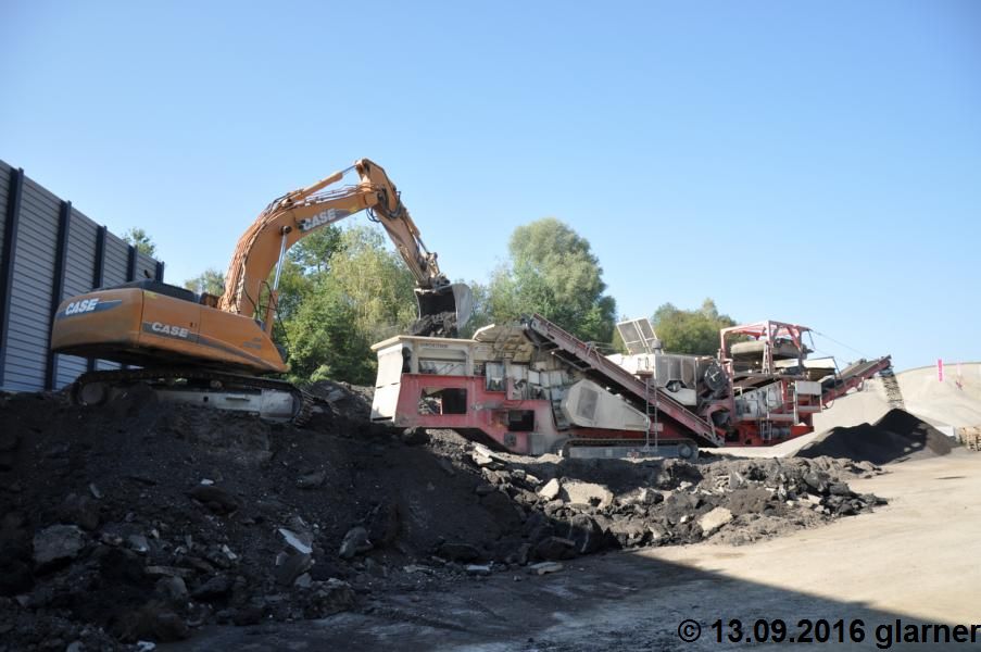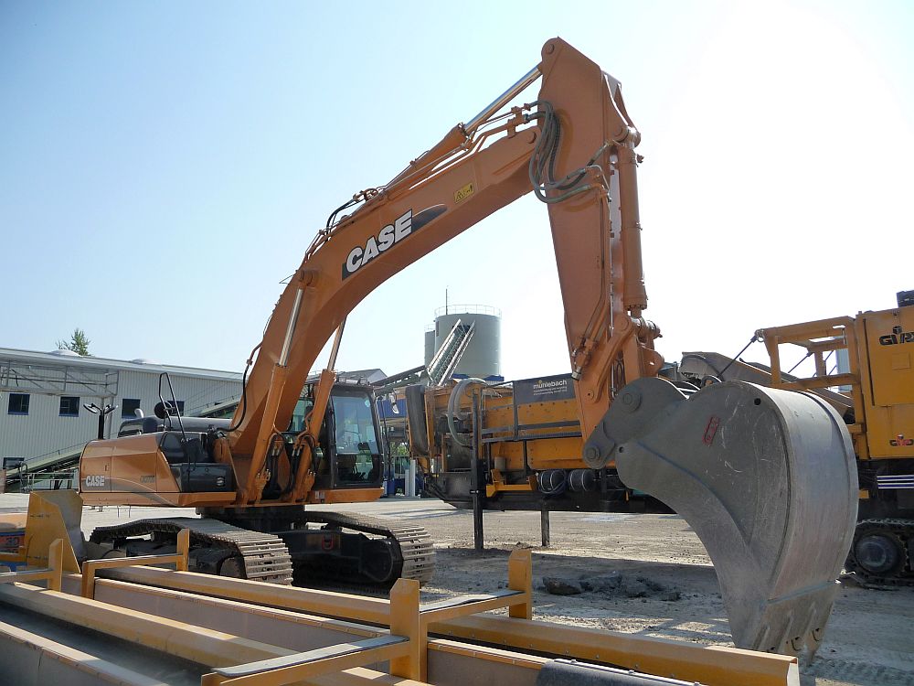 Der CASE CX 370B vom Mühlebach ist Stammkunde in unserem Kieswerk. Er beschickt dort einen Gippo Brecher mit Betonabbruch.