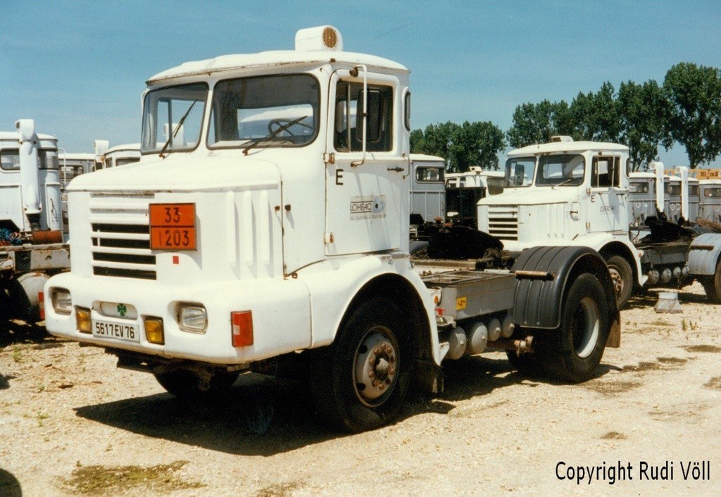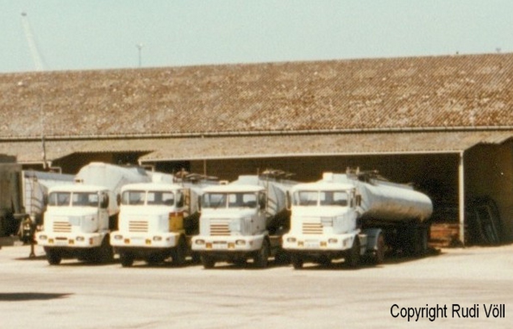 Ich bin im Juni 1996 mal in Grand Couronne gewesen und habe die Spedition entdeckt, von der ich vorher schon mal was gelesen hatte. Neben moderneren Frontlenkern waren noch viele der Tontons im Einsatz. Ich habe ein paar Bilder gemacht, teilweise über den Zaun, teilweise einfach so hintenrum auf den riesigen Abstellplatz. Dort standen dutzende der stupsnäsigen Zugmaschinen herum. ich könnte mich sonstwohin beissen, daß ich nicht mehr Fotos gemacht habe