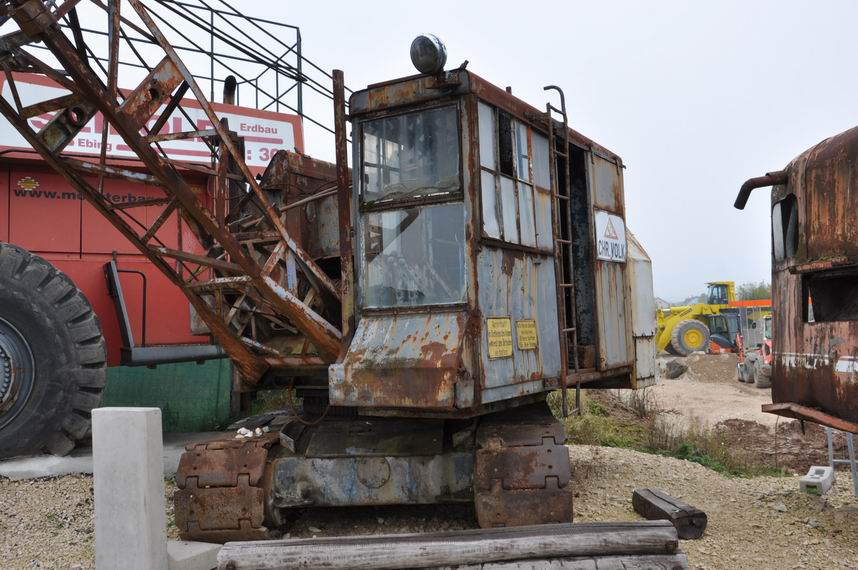 Für alle Menck Fans, die schon immer wissen wollten, welche Bagger beim Seibold stehen, war ich kürzlich vor Ort und habe die Geräte in Augenschein genommen. Um es gleich vorweg zu nehmen, der Zustand aller Geräte ist verbesserungswürdig, nach meiner Einschätzung laufen nur noch der Ma (24226/Auslegerunterteil 22368 - allerdings mit einem nicht originalen Deutz A4L514 Motor) und der M60 mit Tieflöffel (51608-610), der andere M 60 (50005 Greifer 32349) und der M 90 (49671)sind seltsamerweise einbetoniert. Der M 75 (30844) war ja schon bei der Bergung fest, da hat sich nichts geändert, und der M IV bedarf ja zum Wiederaufbau eine sechsstellige Summe, dieser ist übrigens wenigstens recht sauber, die anderen Bagger triefen nur so von alter Schmiere, positiv gesehen, ist ein guter Korrosionsschutz. Allen denen beim Anblick der Geräte der Schaum vorm Mund zusammenläuft, kann ich allerdings sagen, so ein altes Teil wieder herzurichten kostet viel Geld und Zeit und so viele, wie da stehen, das kann man auch dem Seibold nicht zumuten. Alles in allem erst mal ein guter Ansatz das Zeug halbwegs sicher vor der Verschrottung aufzustellen und vielleicht gibt's ja zukünftig noch den einen oder anderen schmerzfreien, der sich den Aufbau zutraut.