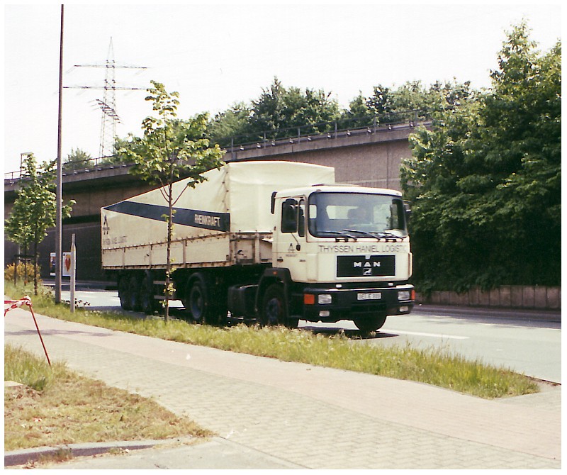 Ok. Dann kann ich zumindestens mit einem, wenn auch nicht besonderem Bild, aufwarten. Es handelt sich um einen M.A.N F90 Sattelzug mit Nahverkehrshaus (evtl. 19.292) von eben der Spedition Thyssen Haniel Logistik - Rheinkraft.